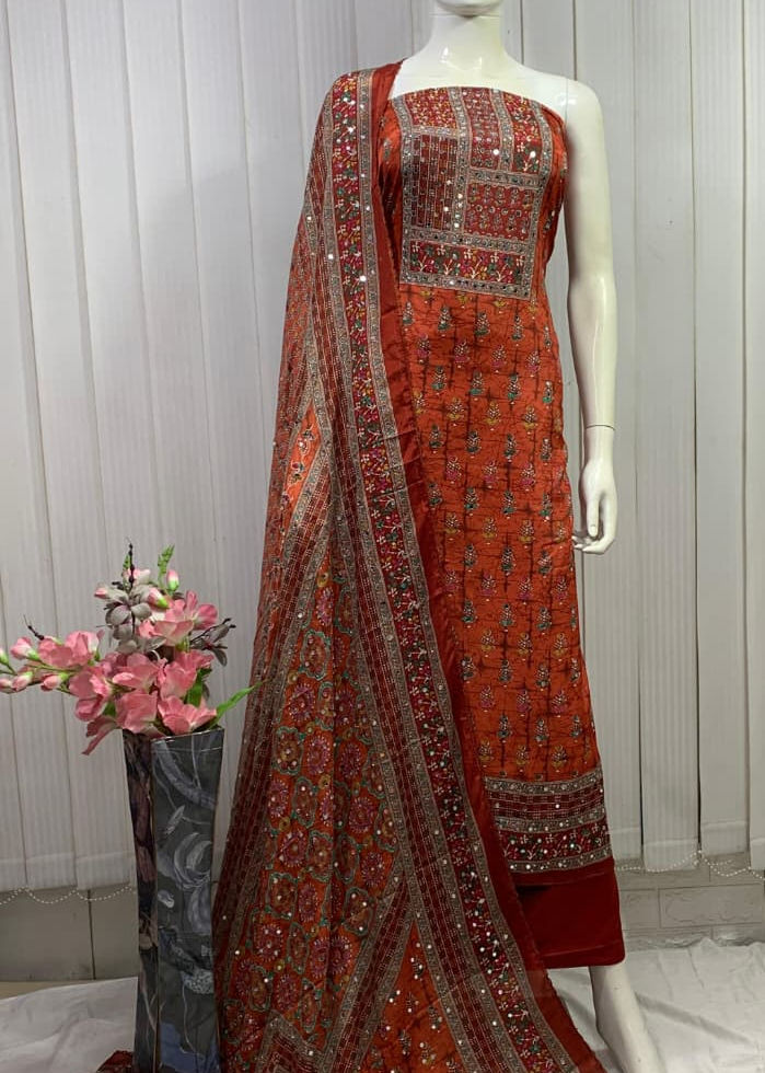 Top: Pure Crepe with Digital Print Neck & Mirror Work (2.5 m)
