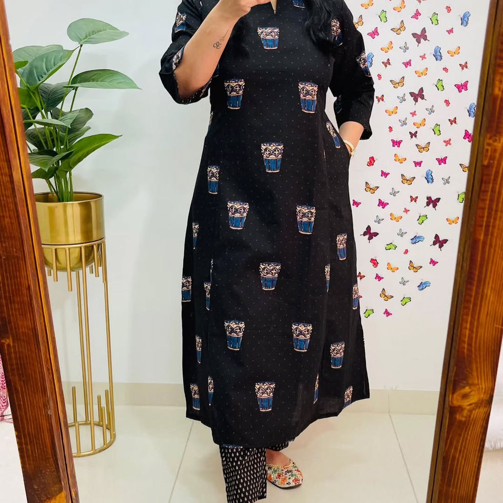 - Design: Features a stylish A-line kurti with a unique cup-like floral print throughout, paired with ankle-length pants. The kurti also has a practical side pocket.