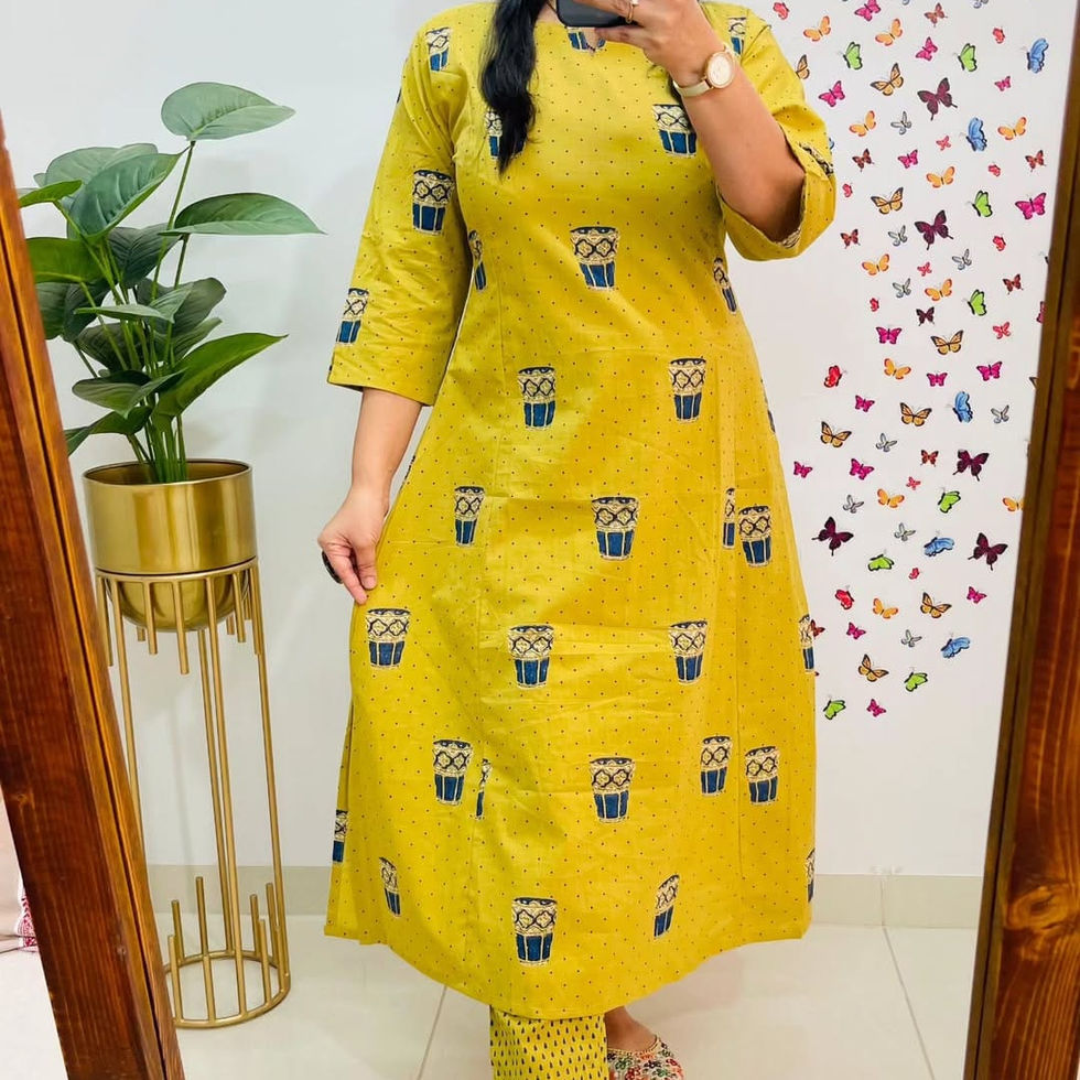 Premium Floral Print Cotton A-Line Kurti Set - Mustard Yellow
