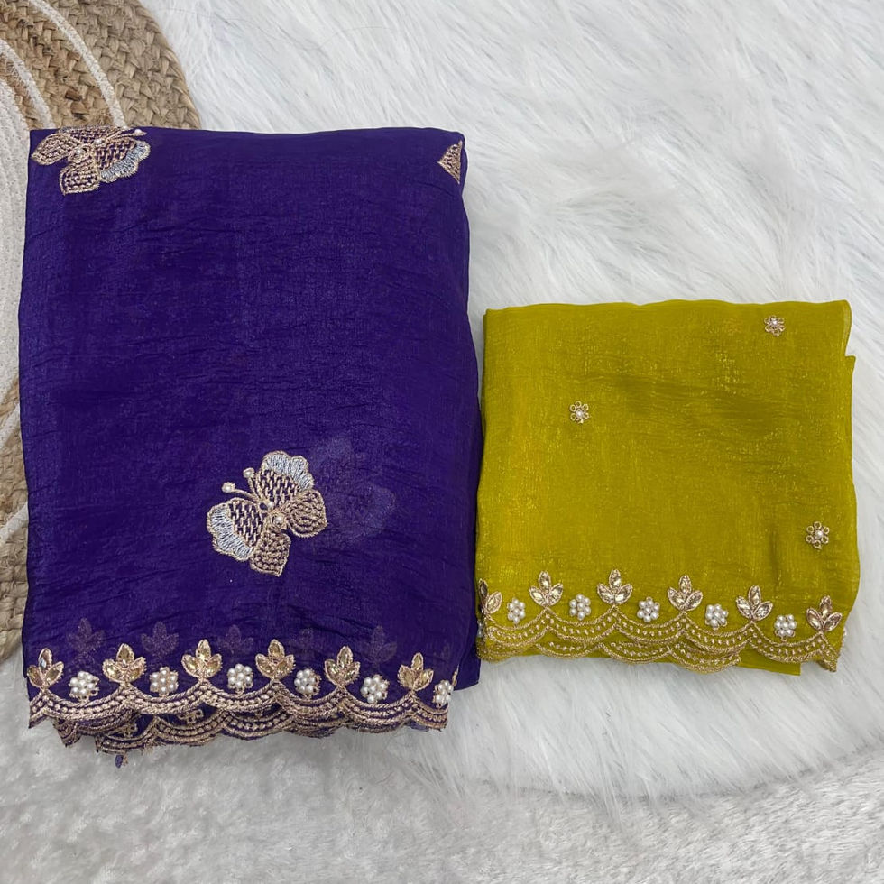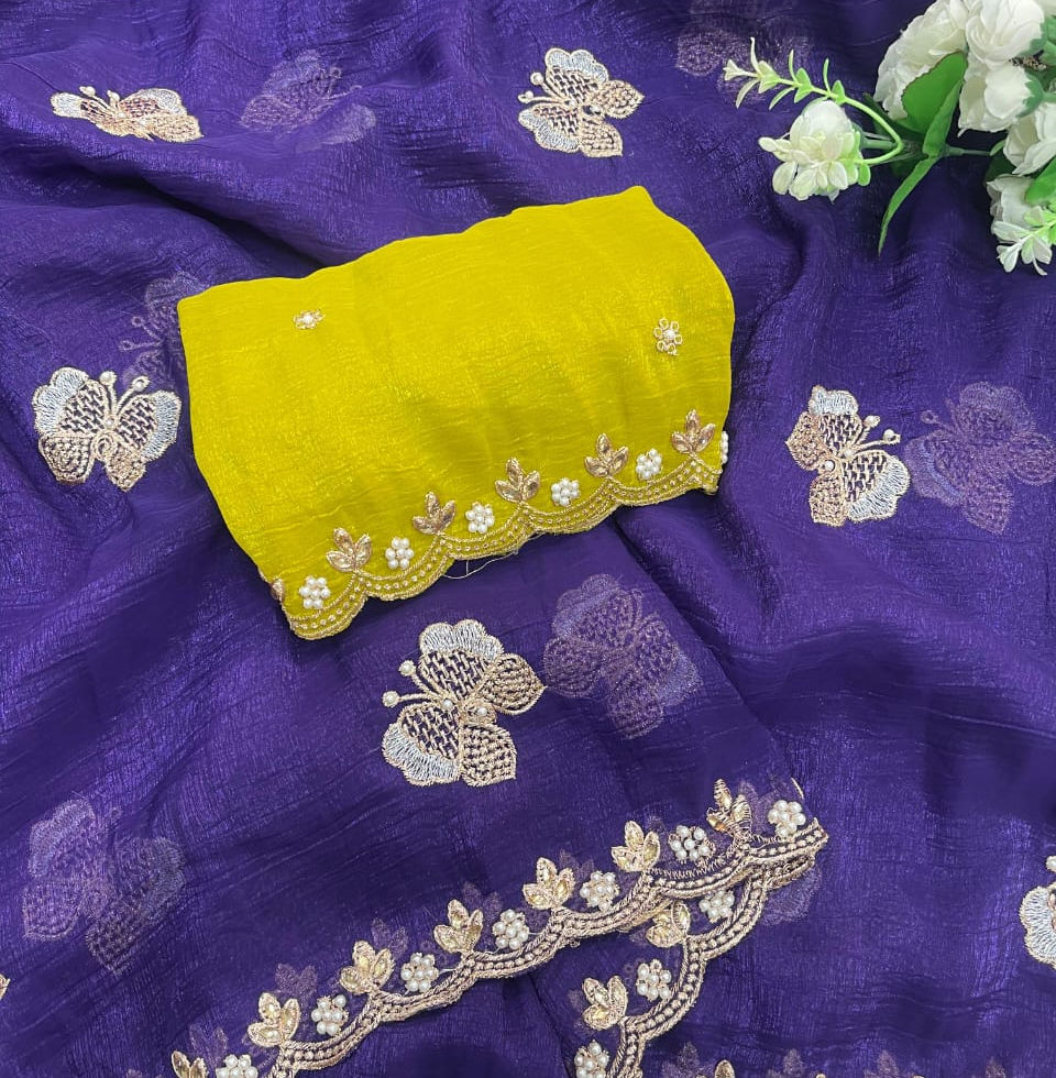 Royal Charm Crunchy Chiffon Crush Silk Saree with Embroidery, Moti Work & Design